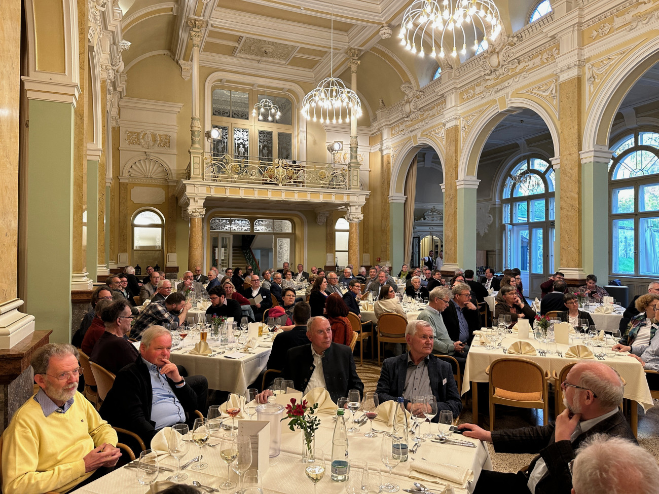 | Alte und neue VertrauenspfarrerInnen und Mitglieder des Hauptvorstandes feierten im Theatersaal des Wildbad. Am ersten Tisch (4. v. links) der langjährige 1. Vorsitzende, Klaus Weber. |